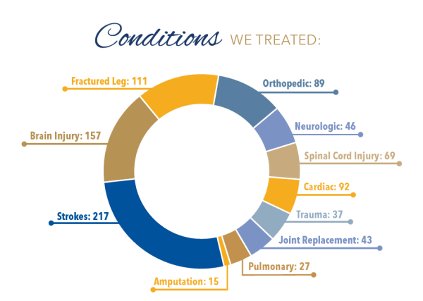 In 2025, Aultman Inpatient Rehabilitation delivered intense, medically necessary and clinically appropriate services to 903 patients on the Aultman Woodlawn campus. All admissions must meet medical and therapy necessity criteria. The following chart shows the types of injuries or conditions that were treated in 2025. The three most treated diagnoses in Aultman Inpatient Rehab were strokes, fractures and brain injuries.